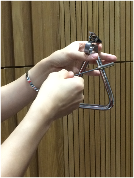 至於最基本的技巧呢,先注意至少都要有一個三角鐵的夾子,把三角鐵掛著,並且方便手指來控製三角鐵。一般打的位置在三角鐵下方的橫杆處,原因是這個地方的泛音最多,聲音最好,在音樂廳和樂團裡演出時,較多的泛音可以讓遙遠的觀眾都可以聽到圓潤的三角鐵聲音,棒子和三角鐵之間要有點角度,不要成水平。