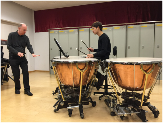 S:學校中,打擊樂老師有四位,每個人教的方向不同,像是我隻教定音鼓和交響樂團演奏這一塊,一位老師教馬林巴,一位教合奏,打擊樂團排練,一位教打擊樂獨奏。我覺得這種方式比較好,采用專家式的教學係統,而不是一位老師教所有方麵,畢竟打擊樂的種類太多。