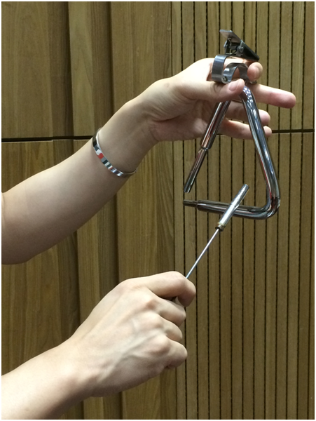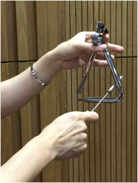 至於最基本的技巧呢,先注意至少都要有一個三角鐵的夾子,把三角鐵掛著,並且方便手指來控製三角鐵。一般打的位置在三角鐵下方的橫杆處,原因是這個地方的泛音最多,聲音最好,在音樂廳和樂團裡演出時,較多的泛音可以讓遙遠的觀眾都可以聽到圓潤的三角鐵聲音,棒子和三角鐵之間要有點角度,不要成水平。